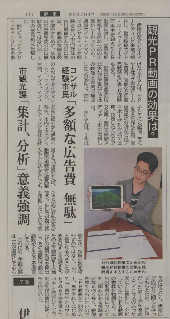 伊東市のPR動画は、目的と成否判断がズレてない?というインタビュー記事が、昨日の伊豆新聞の一面に掲載。