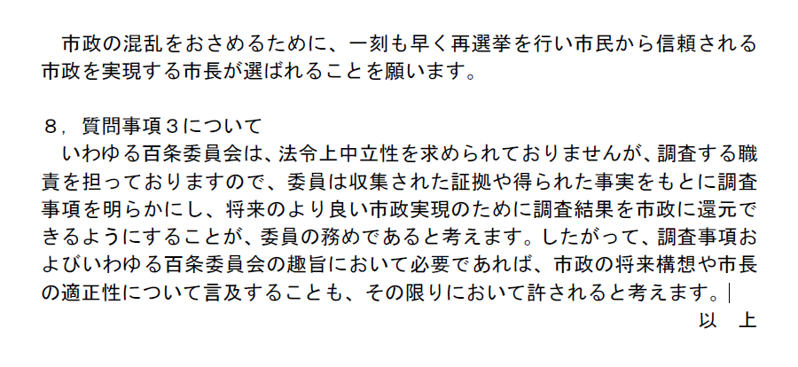 したがって、調査事項およびいわゆる百条委員会の趣旨において必要であれば、市政の将来構想や市長の適正性について言及することも、その限りにおいて許されると考えます。