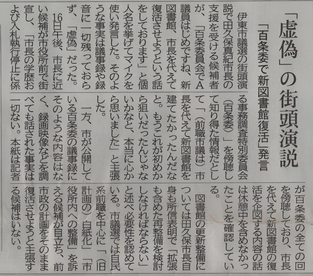 伊豆新聞の記事は私の演説内容を「虚偽」と断定していますが、以下の点において、記事の取材プロセスに疑問があります。